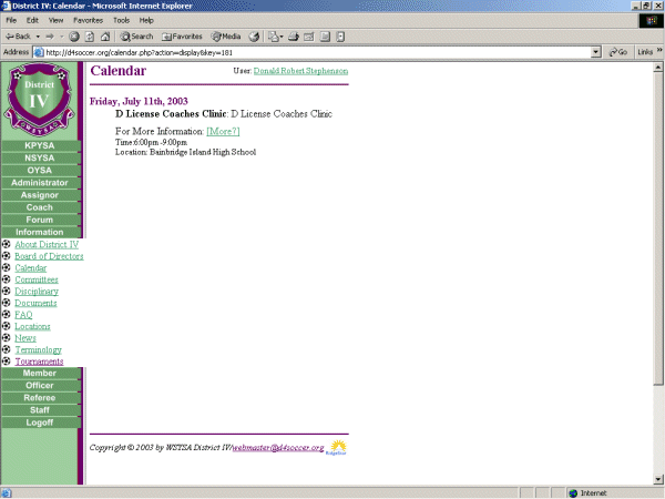 Below you see a Calendar that is selected to view BIYSC events. The cursor is pointing to the "D" License Coaches Clinic event on 07/11/2003.