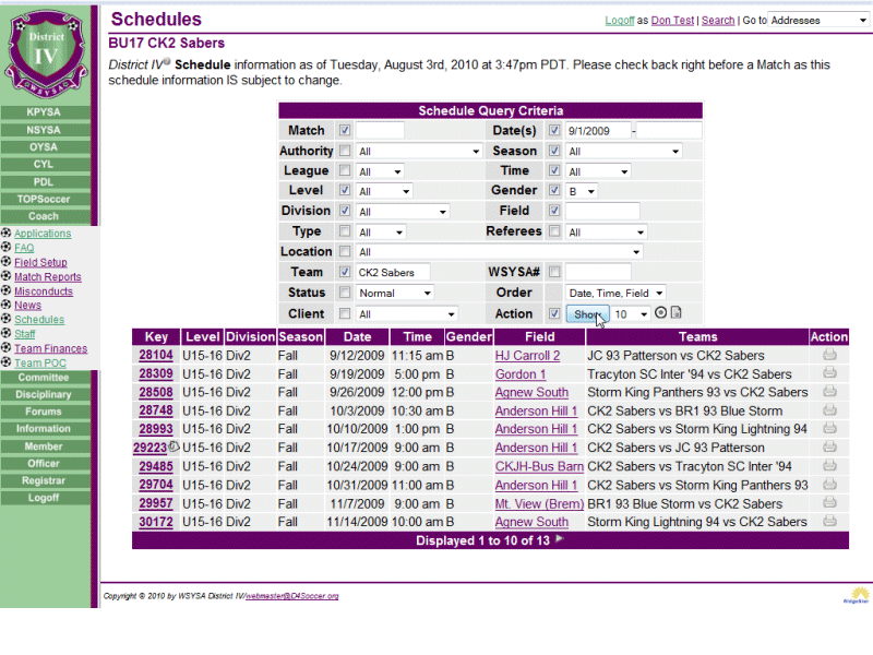 1. Display your Team Schedule by clicking on Coach: Schedules. Then ensure that the Action Box in the Schedule Query Criteria Section is Checked as shown in the example below and then Click Show.Note - It has been reported by one Mac user that the Action Icon - that looks like a Printer was not visible using Safari, but was after switching browsers to FireFox.