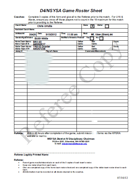 How to Acquire a Completely Filled Out Game Roster Form Printed Directly From This WebsiteThis section of this FAQ is designed to show the Coach/Staff Member how to obtain a Completely Filled Out Game Roster for a Specific Match that includes all pertinent game, Coach and Player Name & Jersey info.