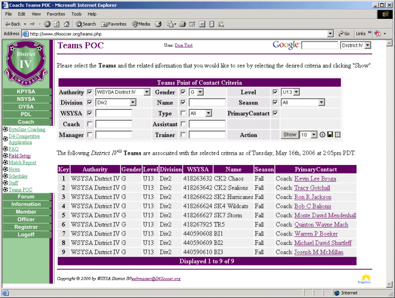 Because of these types of reasons, we have developed a Teams POC feature on the website that is available to any member of a Team Staff (Coach, Assistant Coach, Manager, Trainer). This feature can be found under Coach: Teams POC and will automatically display the POC information for each team within the bracket your team is playing in. You can of course obtain POC information for any group by simply modifying the Selection Criteria at the top of this display. Simply click on the name of the individual you wish to contact and the system will then display that individual's contact information.