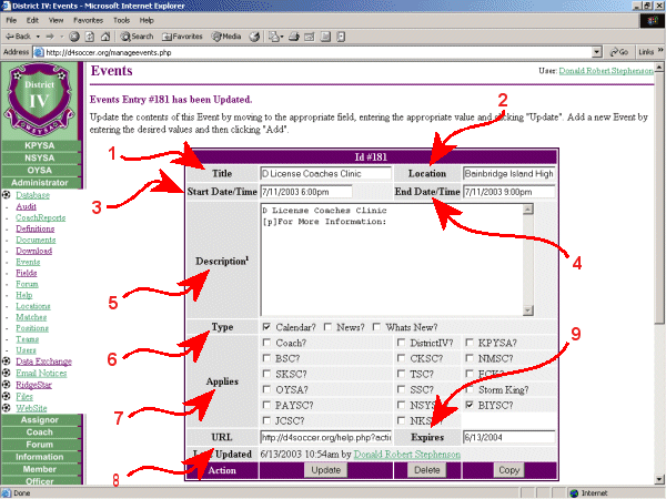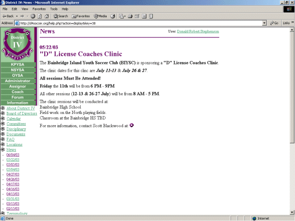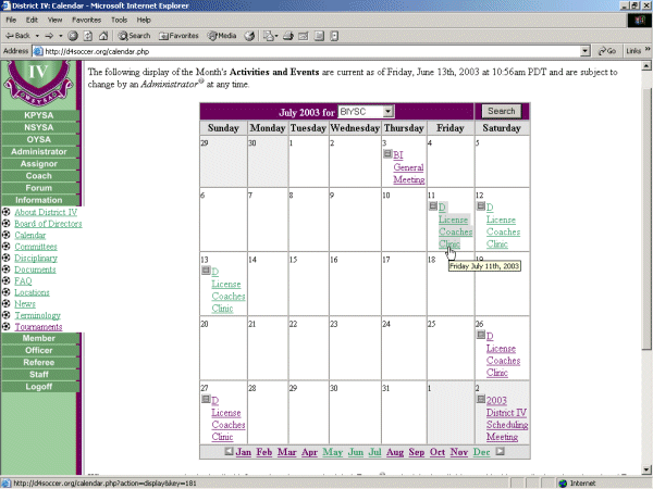 Below you see a Calendar that is selected to view BIYSC events. The cursor is pointing to the "D" License Coaches Clinic event on 07/11/2003.